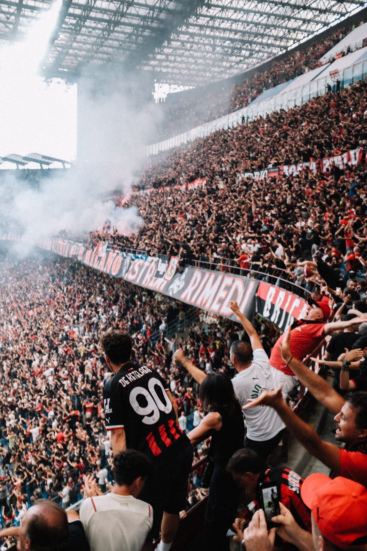 AC Milan and Inter have shared this ground since 1947. Two clubs, one city, a century of opposing feeling, all of it contained within the same walls. The tifo photographs tell that story better than words can. Smoke and colour and noise compressed into a single frame. The Inter end. The Milan end. The same stadium absorbing both, holding the tension without ever letting it break.